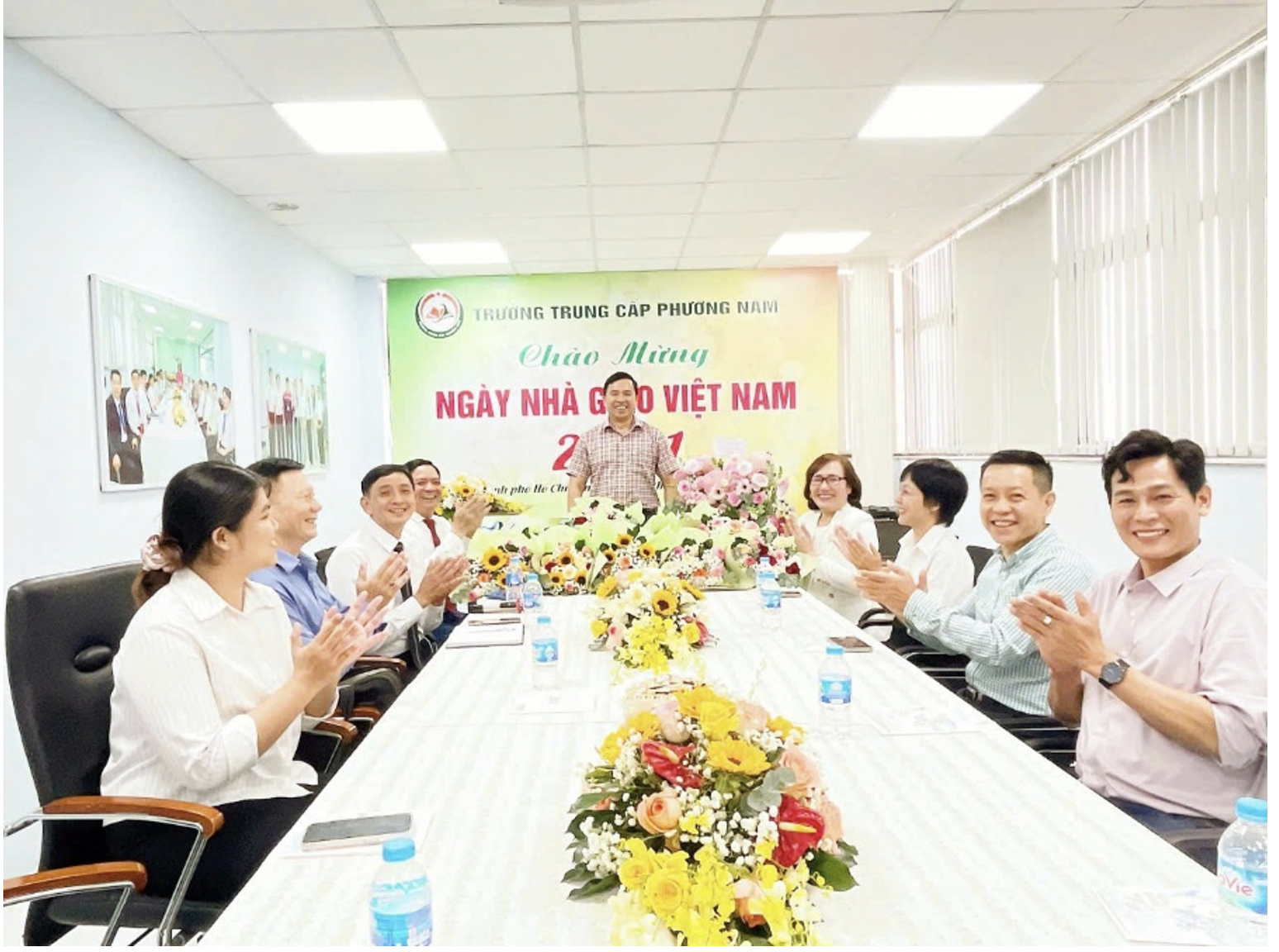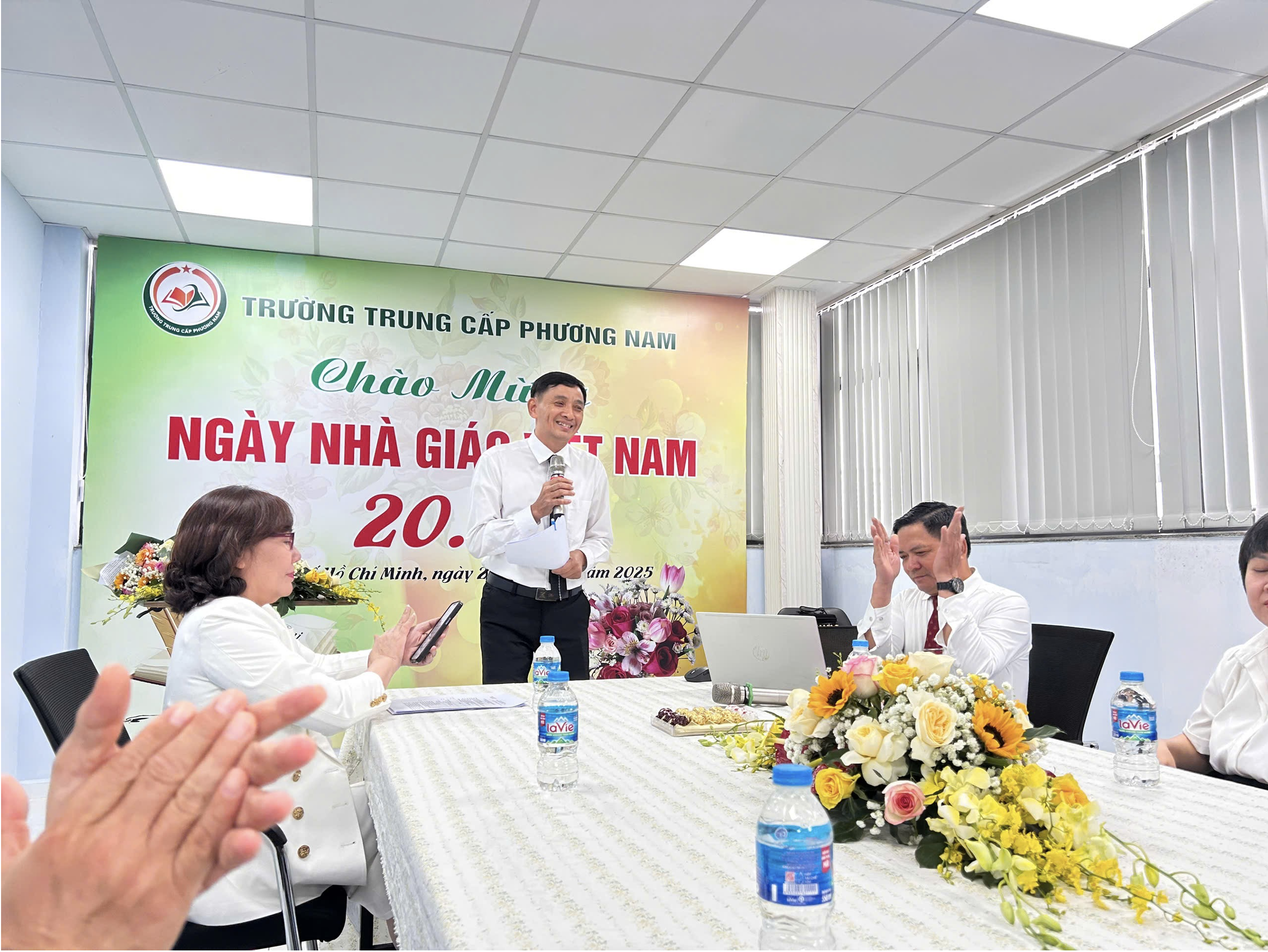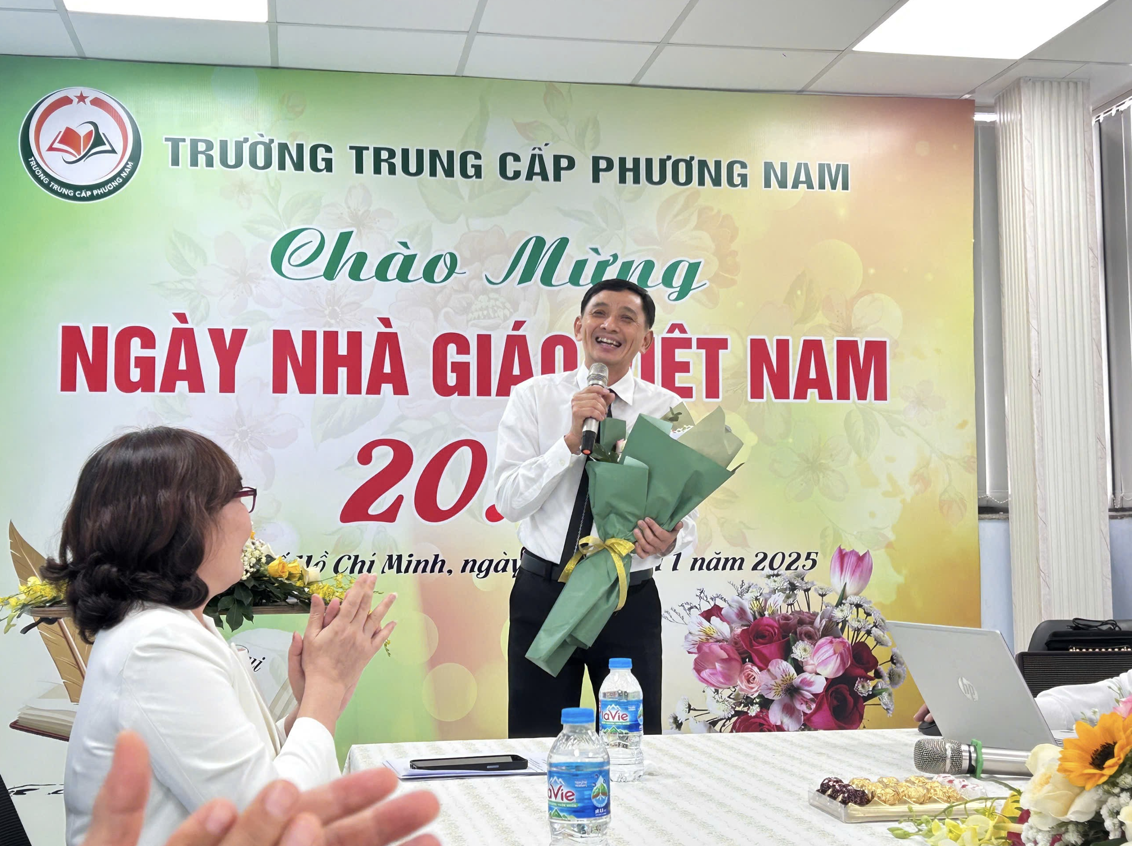 Đại diện giáo viên chia sẻ những cảm xúc chân thành về nghề giáo và quá trình giảng dạy tại Trường Trung cấp Phương Nam. Đại diện học sinh gửi lời tri ân, hoa và quà chúc mừng đến thầy cô, thể hiện truyền thống “tôn sư trọng đạo”
