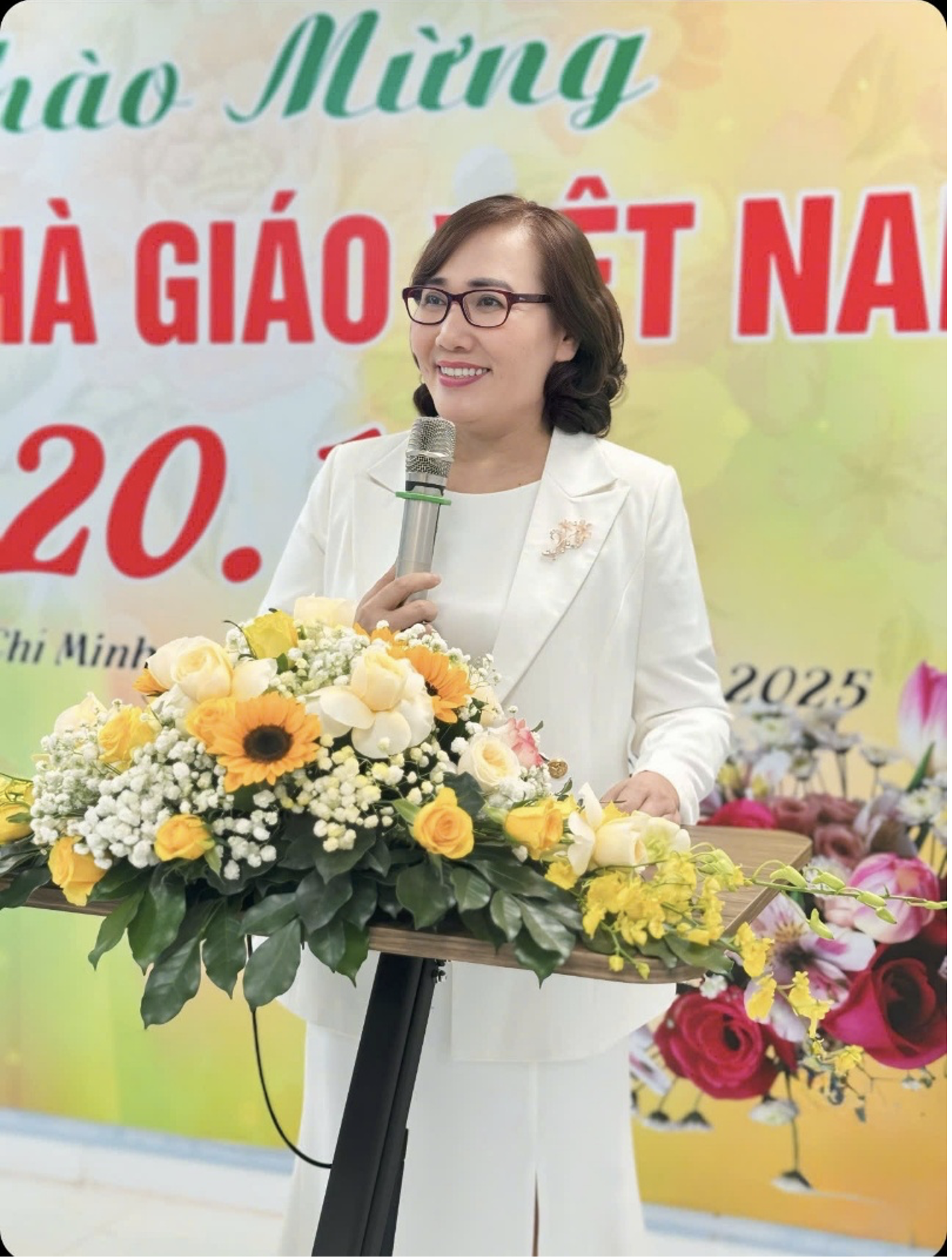 Trong phần phát biểu, cô Lê Thị Lệ Hường bày tỏ niềm tự hào trước những đổi mới và thành tựu mà tập thể nhà trường đã đạt được. Cô gửi lời chúc mừng ngày lễ và khẳng định Hội đồng quản trị sẽ tiếp tục tạo điều kiện tốt nhất để nhà trường phát triển chất lượng đào tạo và môi trường làm việc.